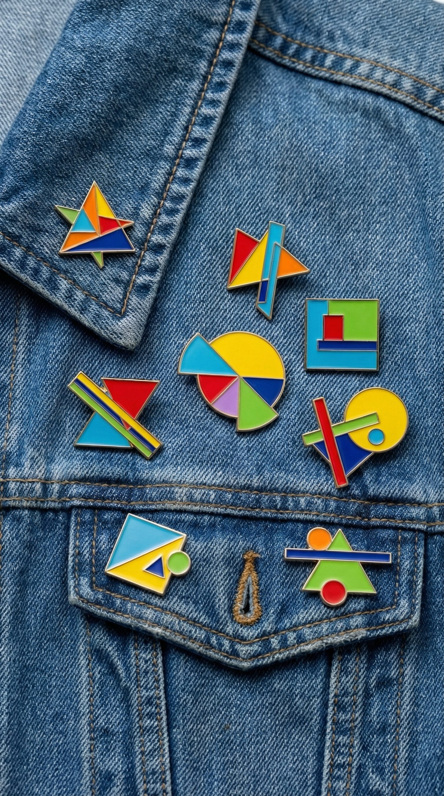 Colorful geometric pins on denim jacket