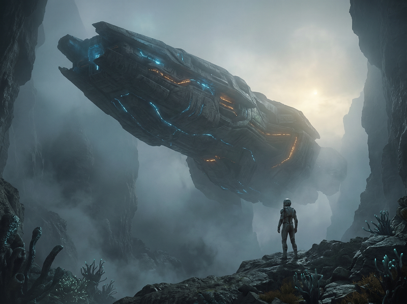 Astronaut Facing a Massive Alien Starship