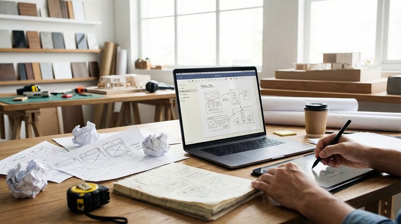 Designer sketching wireframes with laptop and tablet