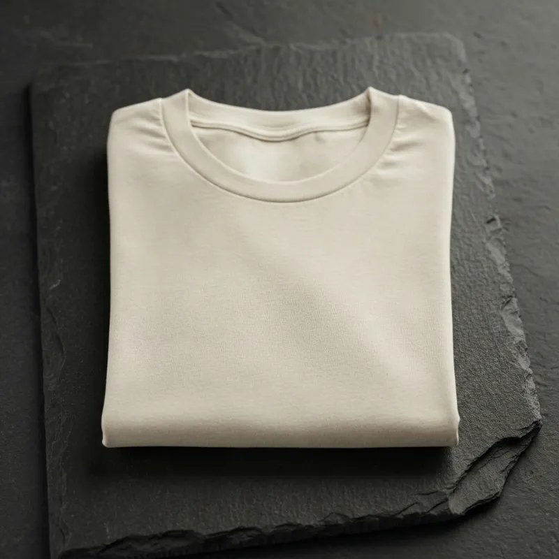 Folded beige T-shirt on dark stone surface