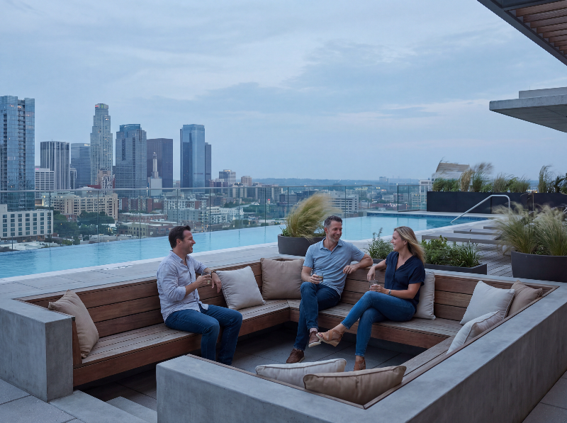 Business colleagues on rooftop lounge at sunset