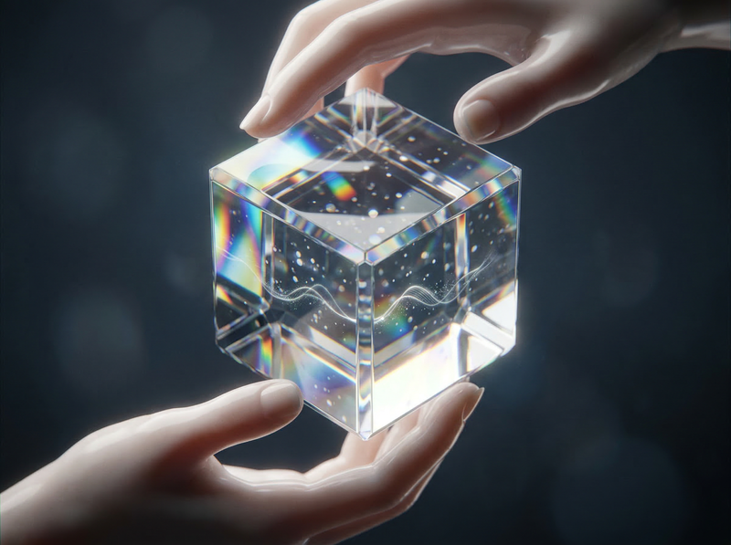 Hands Holding an Iridescent Glass Cube