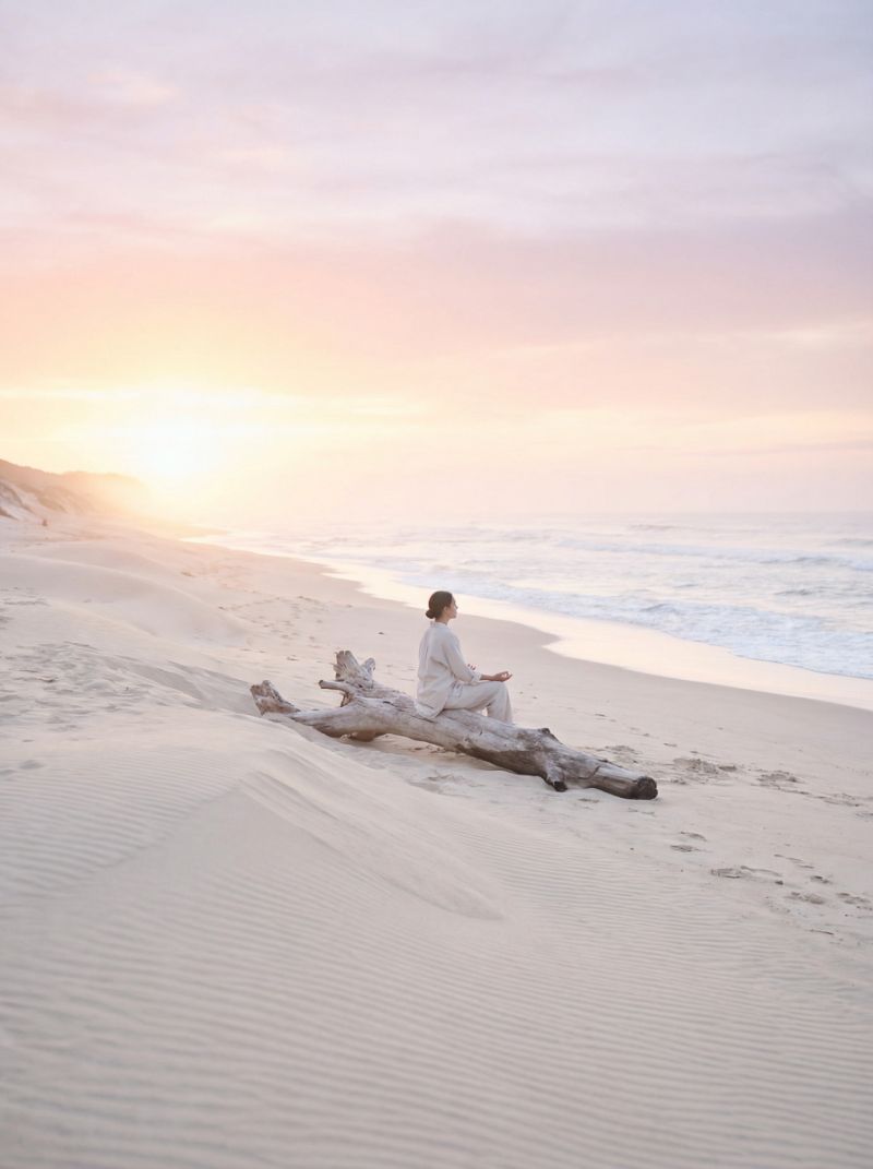 Person meditating on serene sunrise beach