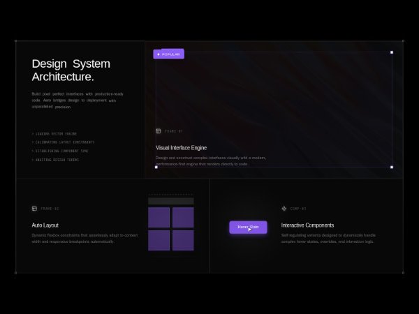 Dark Tailwind-based hero section showcasing a design system platform with animated canvas effects, GSAP text reveals, hover-driven UI overlays, and responsive feature panels. Ideal for SaaS, product, or developer tool landing pages.