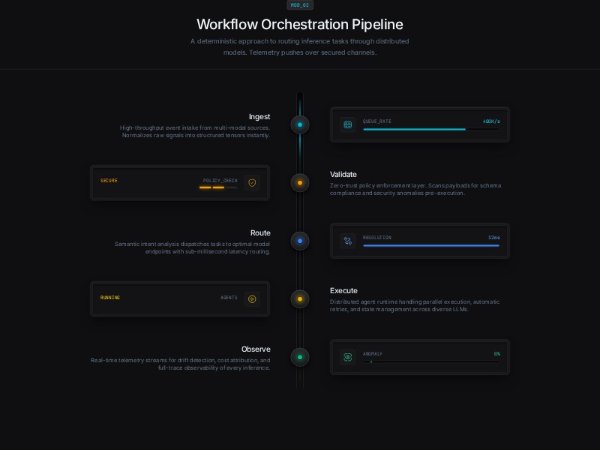 A full-width dark-themed Tailwind section visualizing a workflow orchestration pipeline with animated rail nodes, status cards, telemetry indicators, and alternating step layouts. Ideal for AI, DevOps, or platform feature showcases.