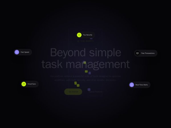 A full-screen Tailwind CSS hero section with a Three.js animated device background, floating benefit pills, bold headline, and dual CTA buttons. Ideal for SaaS, fintech, or productivity product landing pages.