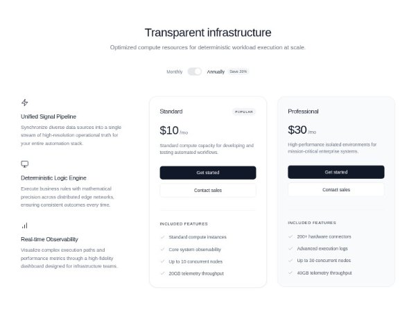 A Tailwind CSS pricing section for infrastructure services featuring a billing toggle, introductory feature highlights, and two plan cards with actions and included features. Ideal for SaaS, cloud, or enterprise product landing pages.