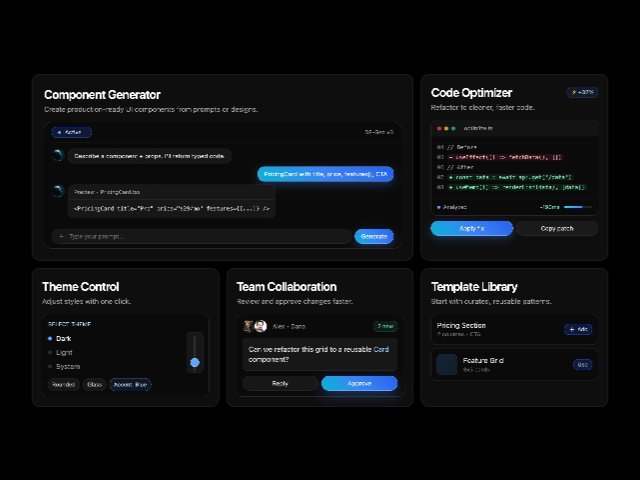 Responsive Tailwind grid presenting dark, glassmorphic cards—component generator chat, code optimizer, theme switcher, collaboration feed, and template library. Includes hover effects, scroll animations, and CTA buttons for SaaS dashboards or landing pages.