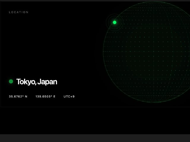 A dark-themed location card featuring a canvas-rendered animated globe highlighting Shenzhen with pulsing marker, coordinates, and timezone details. Uses utility-style classes and custom CSS animations for dashboards, profile panels, or travel/location interfaces.