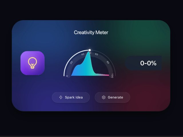 A Tailwind CSS glassmorphism card featuring a creativity gauge with SVG meter, glowing icon, animated liquid wave, and action buttons. Ideal for dashboards, idea generators, or playful status UI panels.
