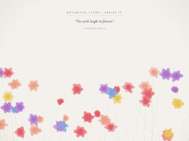 Full-screen animated watercolor-style botanical canvas background with SVG filters and paper texture, revealing a serif quote overlay after stems and flowers finish drawing. Built with Tailwind utility classes and custom canvas animation.