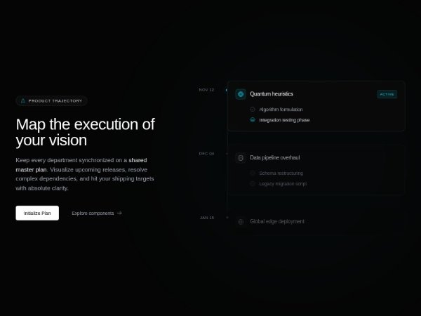 Dark Tailwind CSS hero section featuring product strategy copy, CTA buttons, and a vertical roadmap timeline UI with milestone cards, status indicators, and responsive layout. Ideal for SaaS product planning, launch pages, or roadmap showcases.