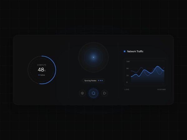 A full-screen dark glassmorphism dashboard interface with animated metric gauge, central orb controls, and network traffic chart. Built with Tailwind CSS, suited for admin panels, system monitors, and sci-fi product demos.