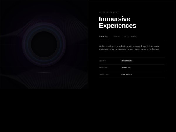 A high-end dual-column feature section featuring a stylized play button, background image overlays with blur effects, and detailed project meta-information. Ideal for showcasing immersive development or cinematic case studies.