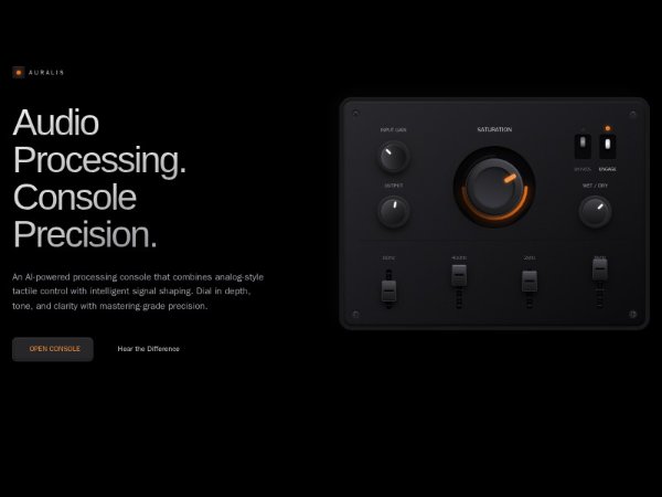Full-width hero section for an AI audio processing console, combining marketing copy, dual CTAs, and a detailed skeuomorphic control panel preview. Built with Tailwind-style utility classes, ideal for SaaS, plugins, or audio tool landing pages.