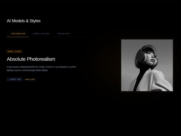 A dark-themed Tailwind CSS feature section with interactive tabs showcasing AI image generation models and styles. Includes model details, command chips, preview images, and JavaScript-powered content switching for product or landing pages.