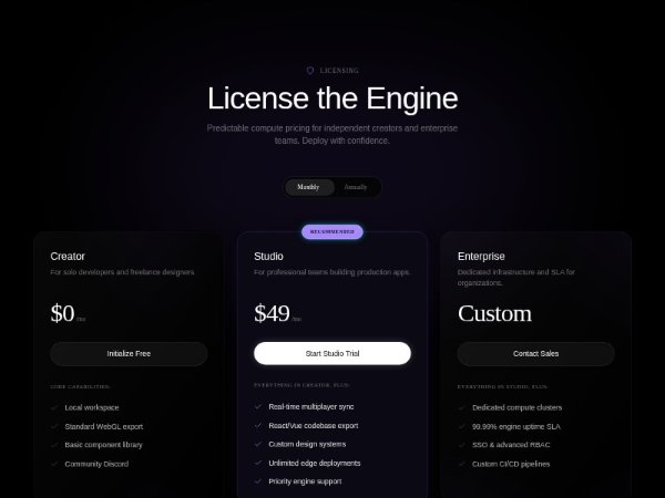 Dark-themed Tailwind CSS pricing section with monthly/annual billing toggle, three plan cards, featured recommended tier, and animated price transitions. Ideal for SaaS, developer tools, and enterprise product landing pages.