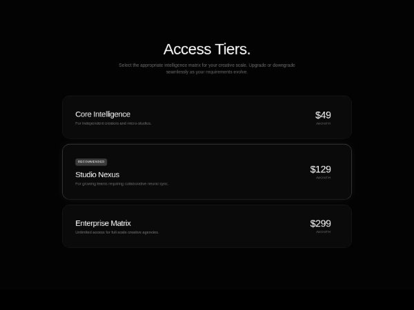 A full-width pricing section with three expandable subscription tiers, dark futuristic styling, hover interactions, and CTA buttons. Built with Tailwind CSS classes, ideal for SaaS, AI, or creative platform plan comparisons.