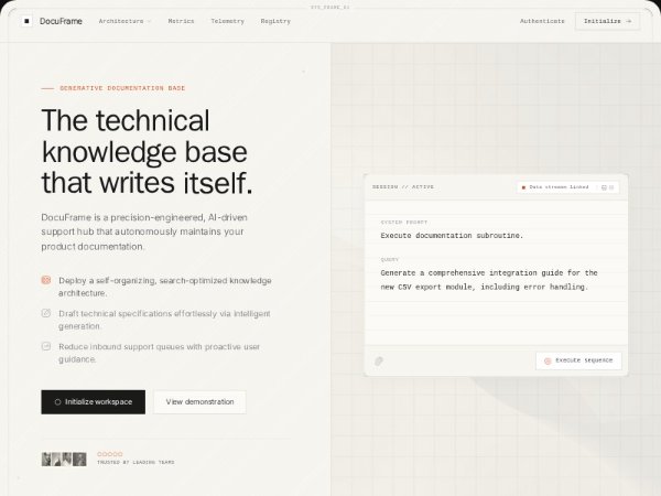A sophisticated technical hero section with a blueprint aesthetic, featuring a framed layout, GSAP-powered text reveal animations, and a simulated terminal-style chat interface. Ideal for developer tools, AI platforms, and technical documentation products.