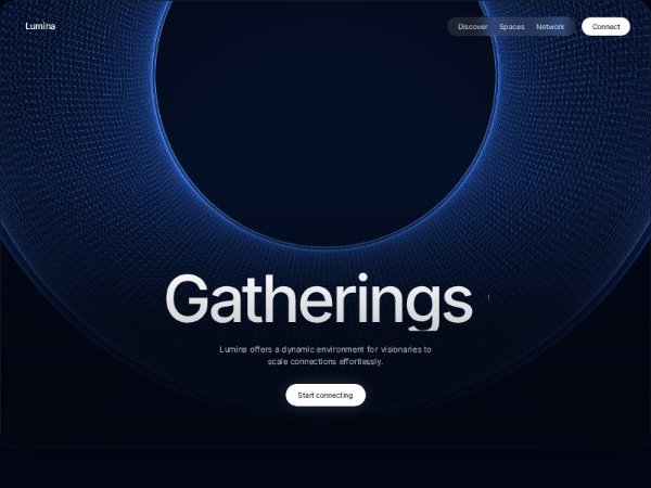 Dark landing hero for a networking platform with Tailwind CSS styling, glassmorphism navigation, glowing headline, CTA button, and animated Three.js wireframe background. Ideal for SaaS, community, or event-focused homepages.