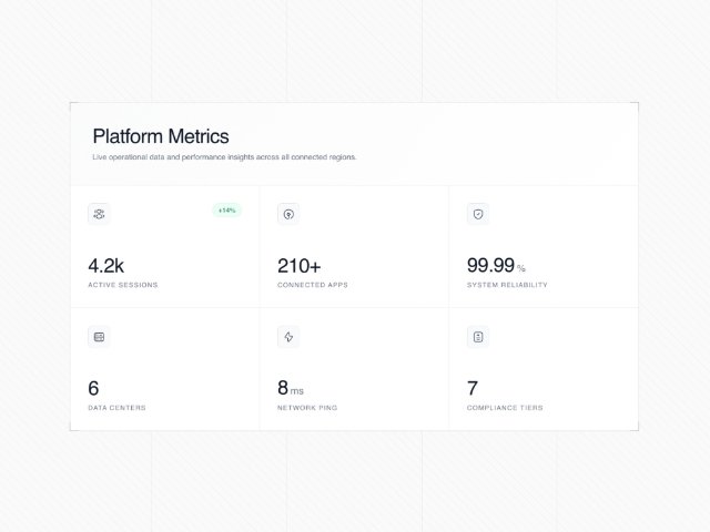 A full-width analytics section showcasing platform KPI cards with a clean grid layout, Tailwind CSS styling, Iconify icons, and GSAP scroll-reveal animations. Ideal for SaaS dashboards, status overviews, or product metric highlights.