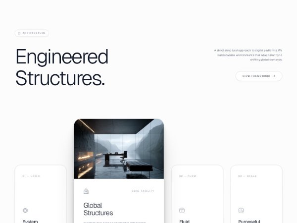 A premium Tailwind CSS hero section for an agency or architecture brand, featuring a bold headline, supporting copy, CTA button, central image card, and interactive service cards. Ideal for landing pages, studios, and corporate websites.