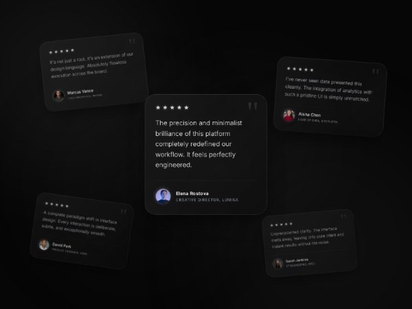 Full-screen testimonial section with floating glassmorphism cards, ambient animated background, avatar glow effects, and Tailwind styling. Ideal for premium SaaS or product landing pages to showcase multiple customer quotes.