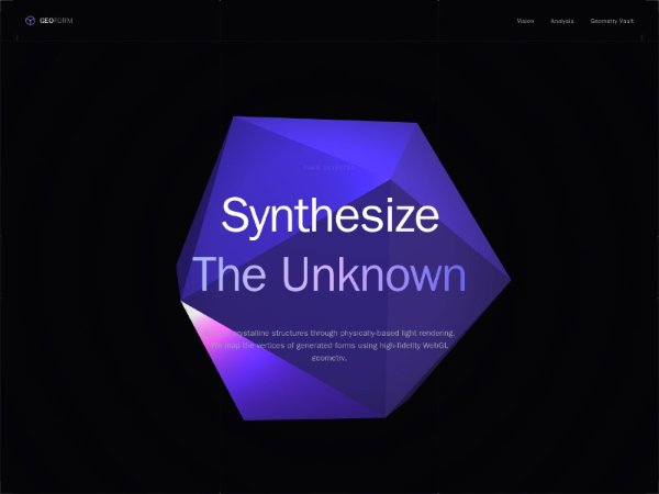 A full-screen futuristic hero section with a responsive navigation bar, animated text reveals, and an interactive Three.js geometric mesh background. Built with Tailwind CSS, GSAP, and Iconify for immersive landing pages or product showcases.