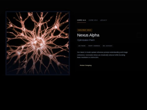 A dark Tailwind CSS feature section with tabbed model/version switching, dynamic image preview, metadata tags, and changelog CTA. Ideal for product updates, release notes, AI model comparisons, or deployment spec highlights.