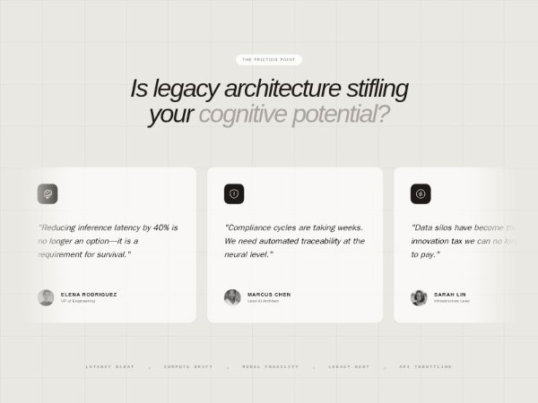 Full-width testimonial section featuring horizontally scrolling cards, architect grid background, and scroll-triggered reveal animations. Built with Tailwind-style utility classes and Iconify icons, ideal for highlighting customer pain points or quotes on SaaS and AI landing pages.