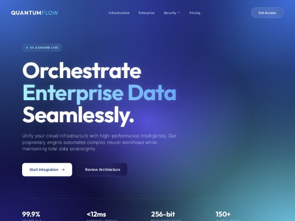 Full-screen SaaS hero layout with navigation, gradient cyber background, headline, subtext, primary/secondary CTAs, animated badge, and KPI metrics grid. Uses Tailwind CSS and Phosphor icons, ideal for enterprise or infrastructure product landing pages.