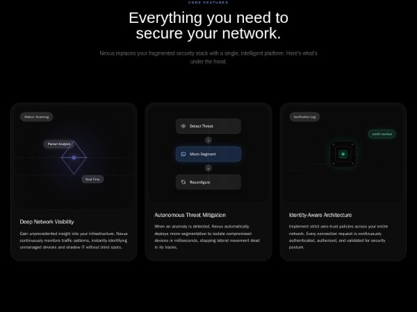 A full-width Tailwind CSS feature section showcasing three cybersecurity platform capabilities with glassmorphism cards, animated visuals, and responsive grid layout. Ideal for SaaS, security, or enterprise product landing pages.