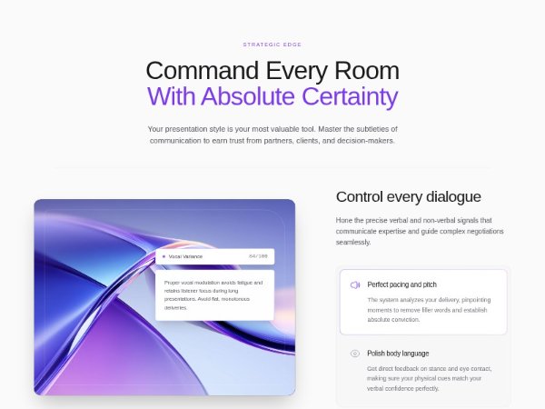 A polished Tailwind CSS feature section for a communication coaching platform, combining animated headline reveals, a featured image with overlay stats, and an interactive capability list with sliding highlight states for product or service landing pages.