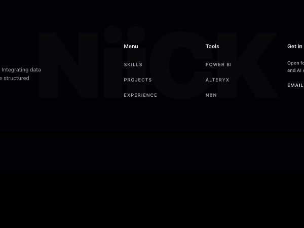 Full-width portfolio footer featuring brand name, background typographic watermark, navigation menu, tools list, contact call-to-action, and availability status. Uses utility classes (Tailwind-style) and responsive grid layout for personal or portfolio sites.