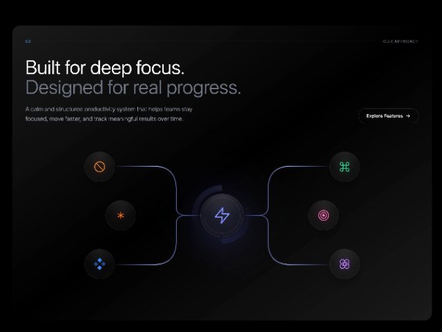 Full-width “Our Approach” feature section with headline, supporting copy, CTA button, and an animated node grid connected by glowing SVG wires. Uses Tailwind-style utility classes and scroll-triggered animations to visualize a focused productivity system.