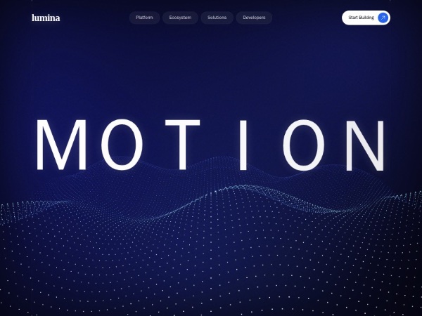 Immersive full-screen hero section for a futuristic tech product, featuring oversized typography, glassmorphism navigation, GSAP text reveals, and a Three.js particle wave background. Built with Tailwind CSS for landing pages and product showcases.