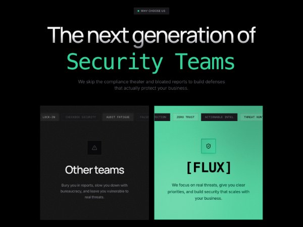 Full-width feature section comparing traditional security teams vs Flux. Includes animated badge, hero-style heading, subtext, and two marquee-enhanced comparison cards. Ideal for SaaS cybersecurity landing pages using Tailwind-style utility classes.