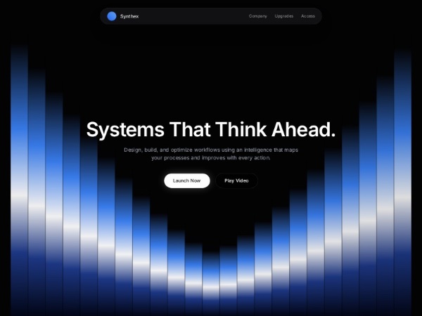 Dark full-screen hero for an AI or workflow platform with glassmorphism navbar, bold headline, CTA buttons, and a JavaScript-animated neon bar background. Built with Tailwind CSS for modern SaaS landing pages.