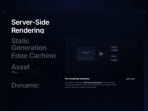 A full-width Tailwind CSS feature section showcasing server-side rendering and edge caching with a dark glassmorphism layout, animated SVG schema, and GSAP reveal effects. Ideal for SaaS, hosting, or developer platform landing pages.