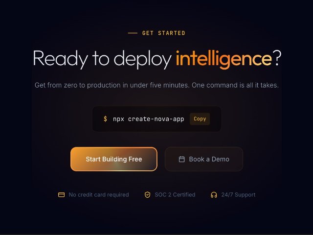 Dark-themed full-width call-to-action section with gradient typography, animated conic CTA button, copyable terminal command, trust badges, and reveal-on-scroll effects. Built with custom CSS and vanilla JS for SaaS landing pages.