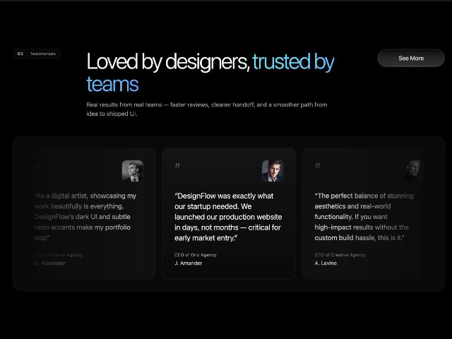Responsive testimonial section with eyebrow label, headline, subtitle, gradient border, animated CTA button and 3 quote cards. Tailwind CSS dark UI, hover/scroll effects and gradient accents make it ideal for landing pages, SaaS sites and portfolios.