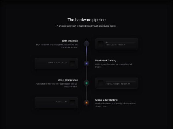 Dark, animated timeline section illustrating a multi-step hardware or ML pipeline. Features scroll-activated progress bars, icons, and alternating step layouts. Built with Tailwind-style utility classes, ideal for showcasing technical workflows or product architectures.