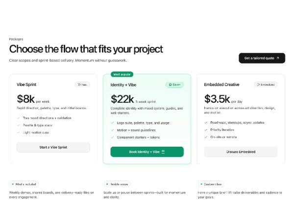 Three-card pricing section displaying service packages with prices, feature lists, highlight badge, and full-width call-to-action buttons. Built with Tailwind CSS grid, responsive breakpoints, and hover effects—perfect for agency or SaaS pricing pages.