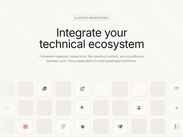 A full-width feature section showcasing system integrations with an icon grid, animated headline reveals, hover interactions, and a CTA button. Built with Tailwind CSS, Iconify, and GSAP for modern SaaS, automation, or platform landing pages.