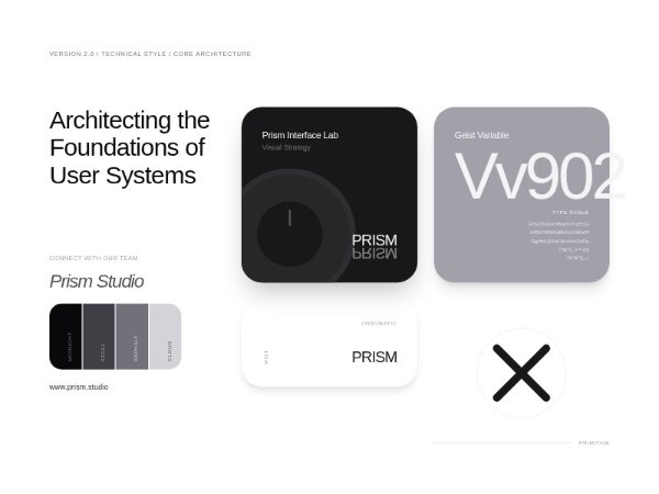 Full-width hero-style layout showcasing a technical brand concept for Prism Studio, with large heading, signature area, color swatches, and a responsive grid of visual cards using Tailwind CSS. Ideal for design system intros or product branding pages.