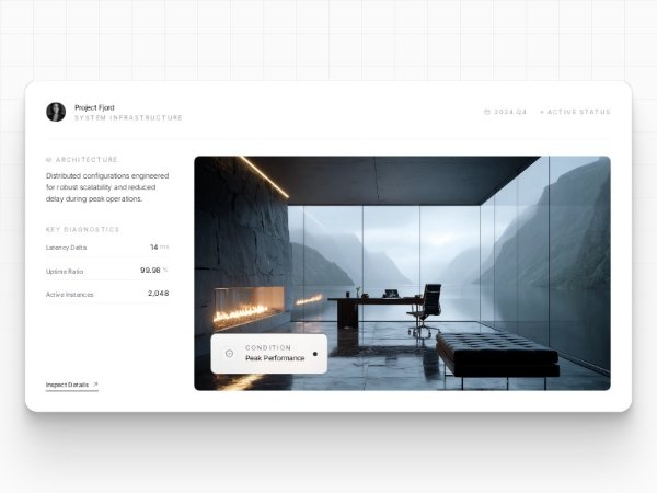 A premium Tailwind CSS feature section presenting project infrastructure details with metrics, status metadata, architectural imagery, and a floating performance overlay. Ideal for dashboards, case studies, or product showcase pages.