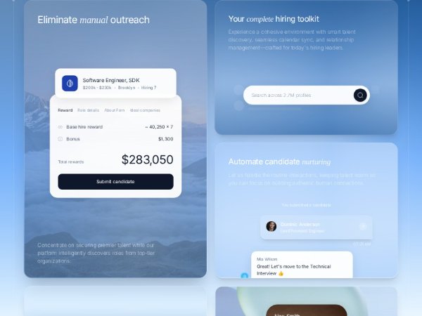 A high-fidelity features section utilizing a responsive bento-style grid. It features GSAP-powered text reveal animations, interactive UI mockups for hiring tools, and a dynamic atmospheric sky background with slow-drift animations and glassmorphism.