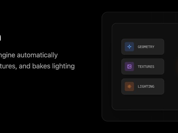 Two-column feature block with headline, supporting copy, and a text link button alongside an animated visualization card illustrating geometry, texture, and lighting optimization. Built with Tailwind-style utility classes for use in product and marketing pages.