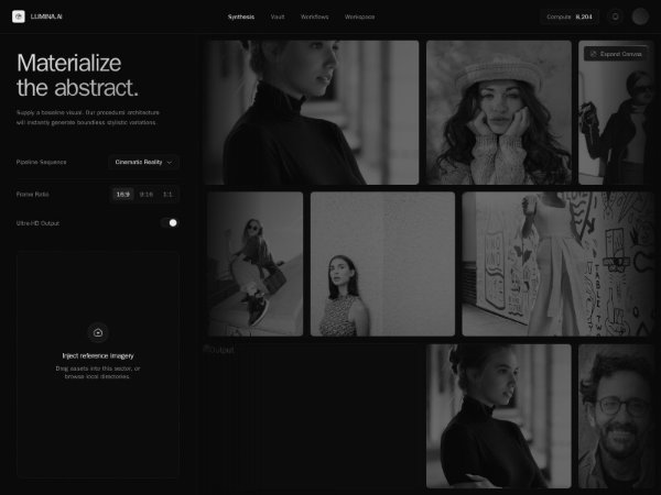 Full-screen dark Tailwind interface for an AI image generation app, featuring a top nav, settings sidebar, upload dropzone, and animated infinite-scrolling output gallery. Ideal for creative tools, media dashboards, and generative AI product demos.