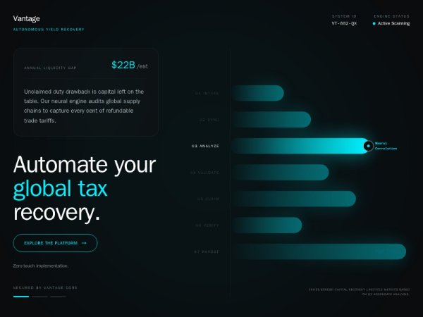 Full-screen dark hero for a SaaS/fintech product featuring headline, CTA button, metric card, and animated multi-step process timeline using Tailwind-style utility classes and custom glow animations.